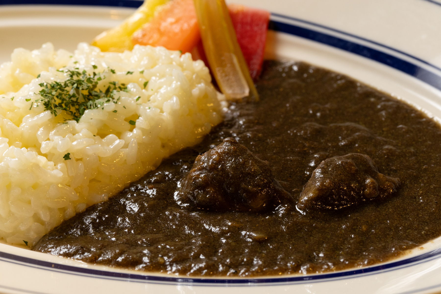 牛肉と野菜をじっくり煮込んだ旨味が詰まったカレーライス。辛さ控えめで、毎日たべれるかも