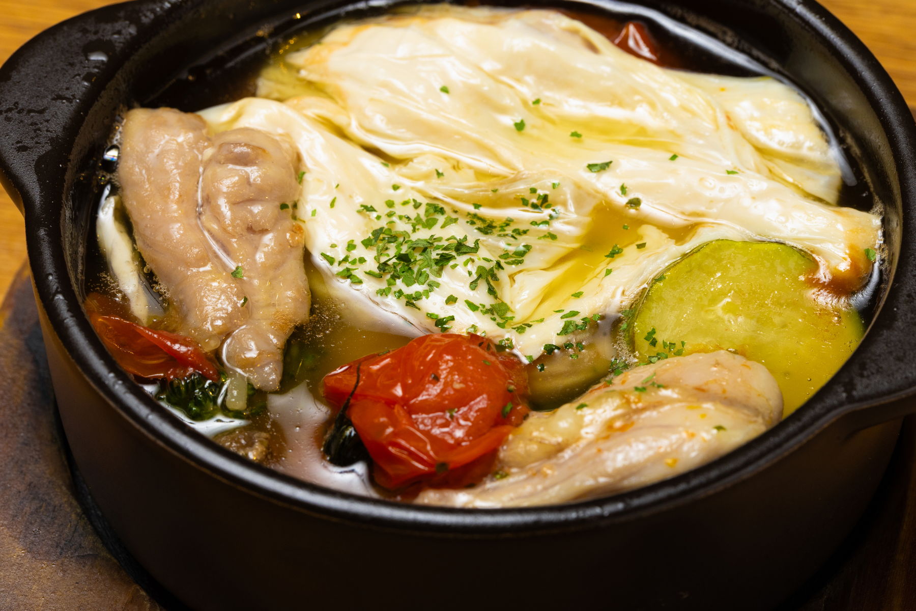 せせりと湯葉のアヒージョ