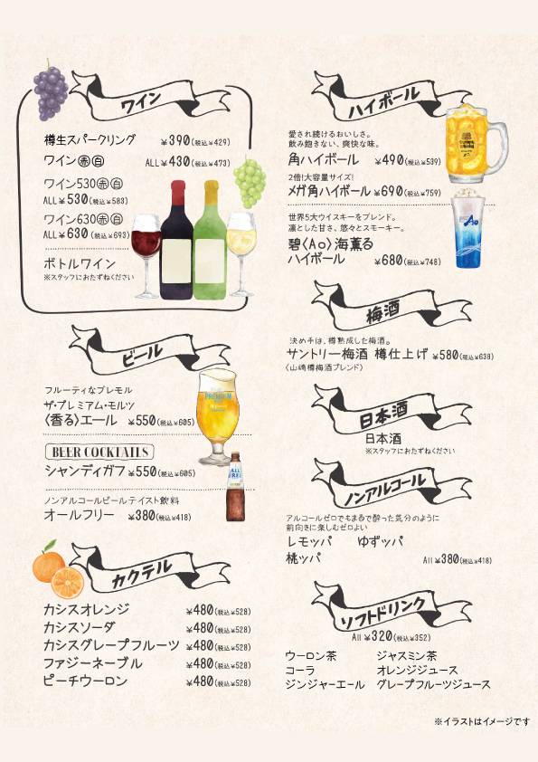 前菜・メイン・パスタ・デザートまで、 女子会・デート・宴会など、どんなシーンでも楽しめる構成となっています。料理に合わせたワインやカクテルなど、ドリンクも豊富に取り揃えています。