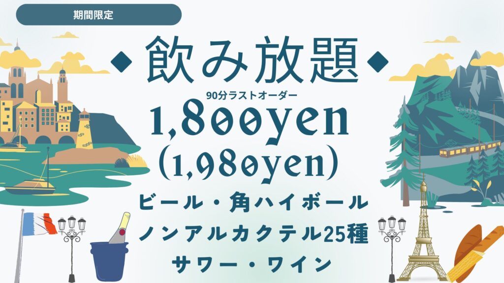 ビールはもちろん、角ハイボールも飲み放題!アルコールが飲めない方には、ノンアルコールカクテルも25種類ご用意しております。お好みの組み合わせでお楽しみください。ラストオーダーは30分前となっております。